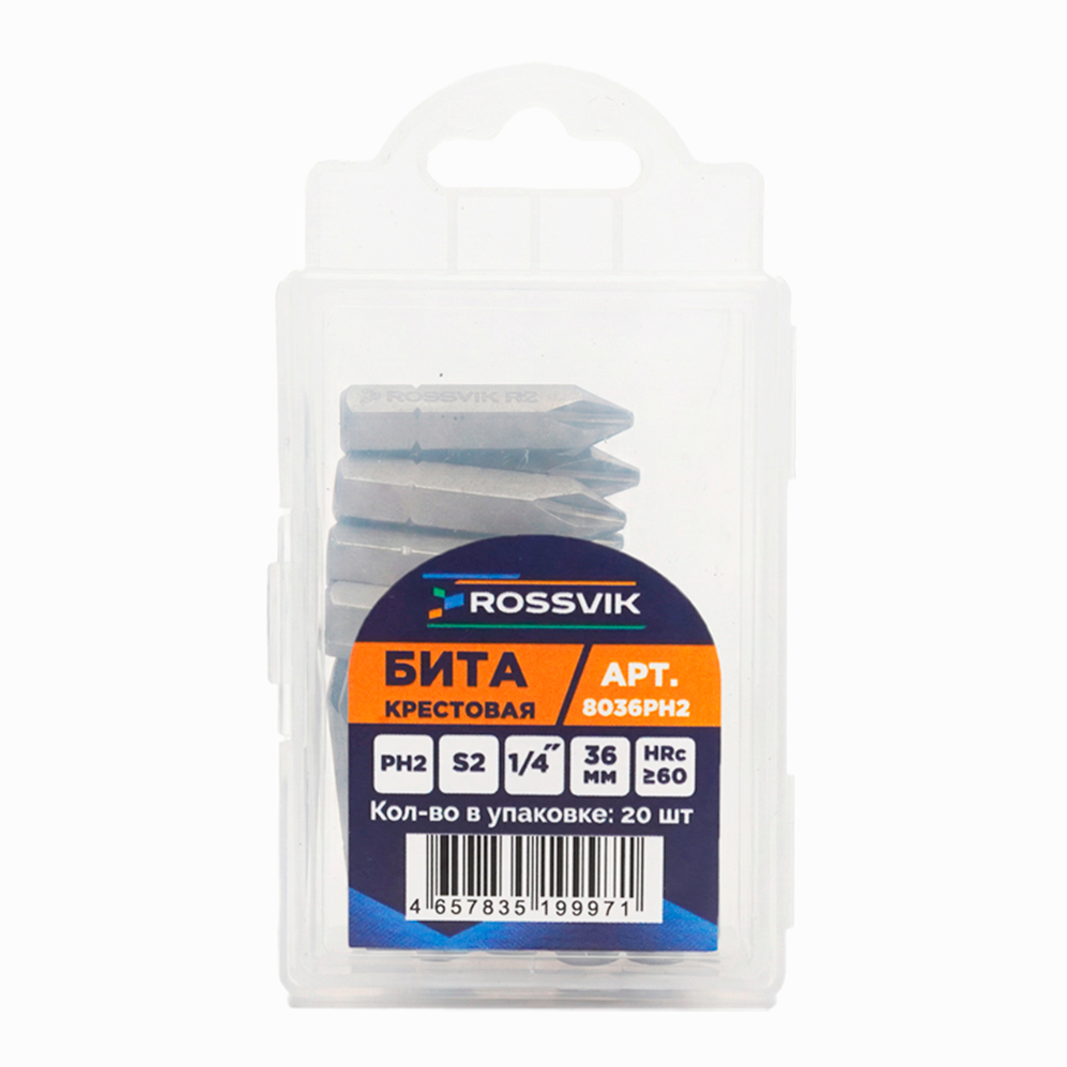 Бита крестовая ROSSVIK 8036PH2, PH2, 36 мм, 5/16", сплав S2
