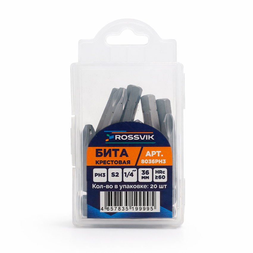 Бита крестовая ROSSVIK 8036PH3, PH3, 36 мм, 5/16", сплав S2