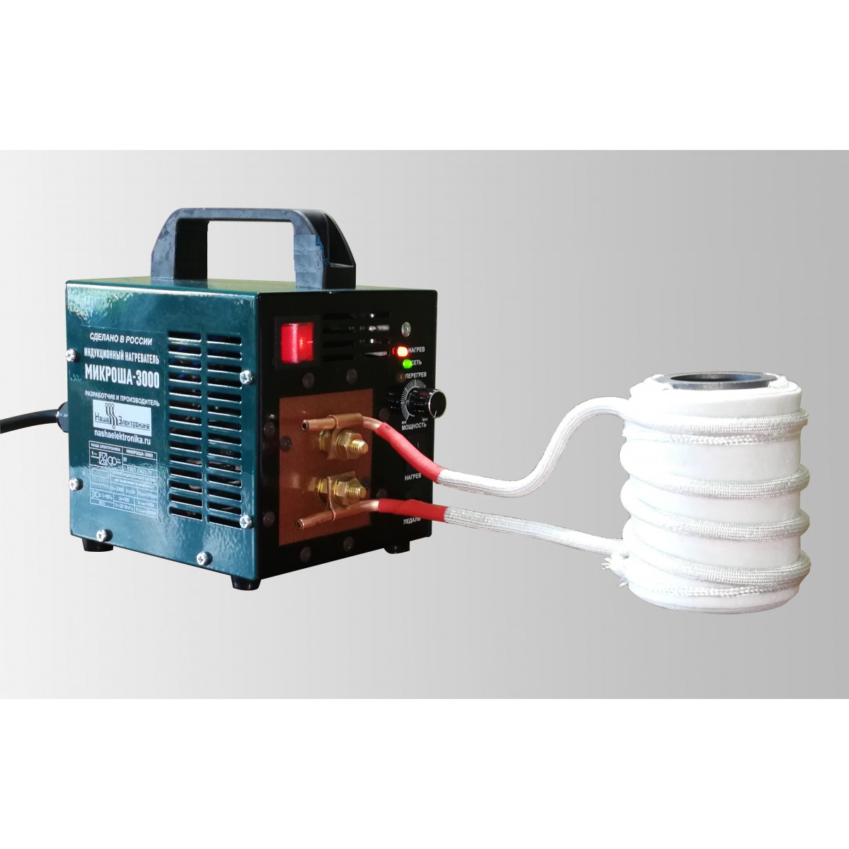 Индукционный нагреватель МИКРОША-3000, разработанный и производимый компанией НАША ЭЛЕКТРОНИКА, является дальнейшим развитием идеи, заложенной в МИКРОШЕ-2000, т.е. предназначен для нагрева металлических деталей: гаек, болтов, рычагов, тяг и плоских железных поверхностей под действием переменного магнитного поля в индукторе, для ТВЧ нагрева небольших заготовок для закалки, а так же для нагрева и сгибания металлических прутков.