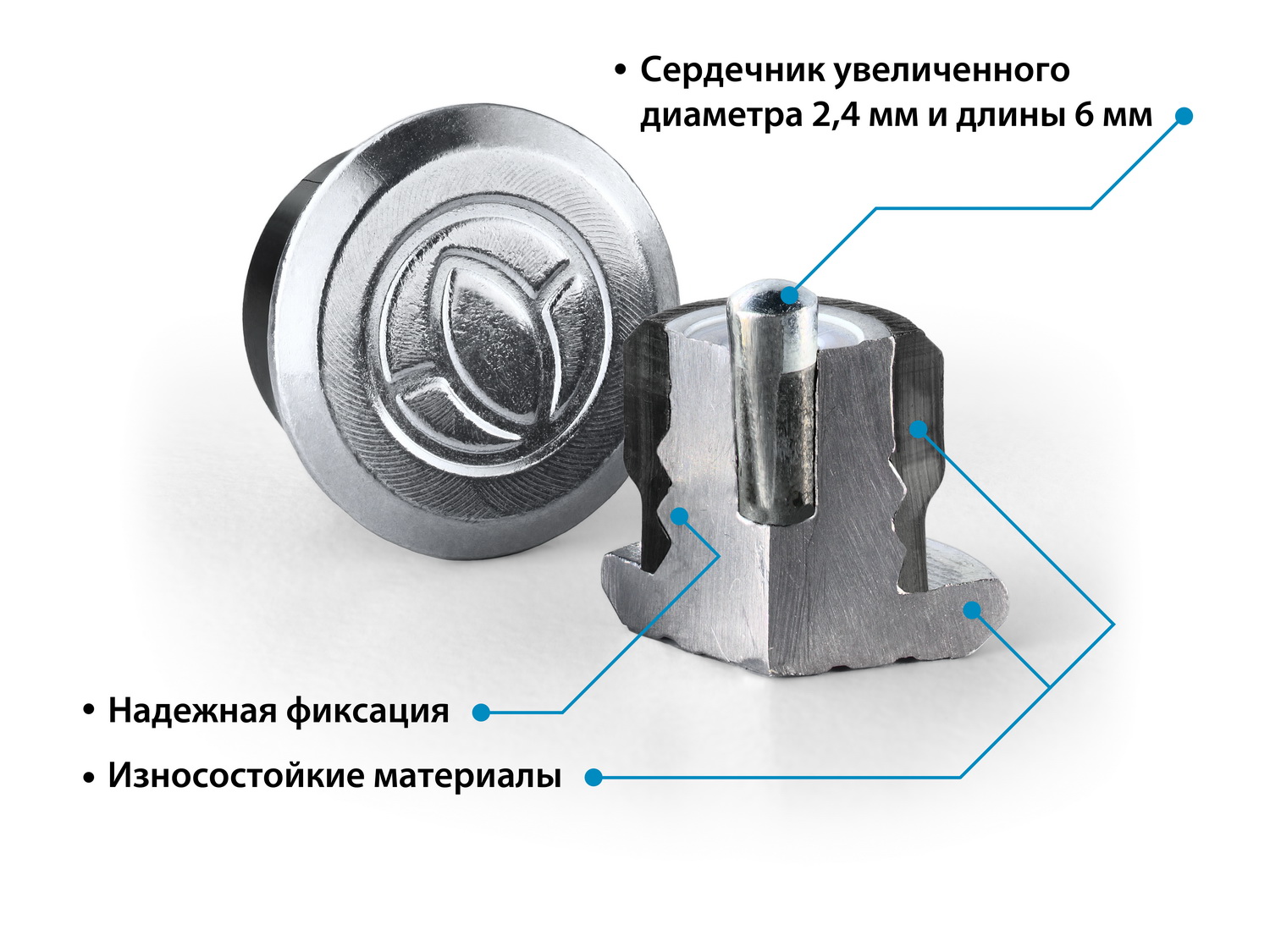 Сердечник увеличенного размера диаметром 2,4 мм и длиной 6 мм обеспечивает эффективную работу шипов при торможении.